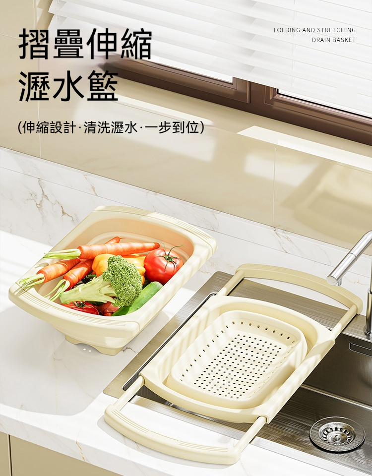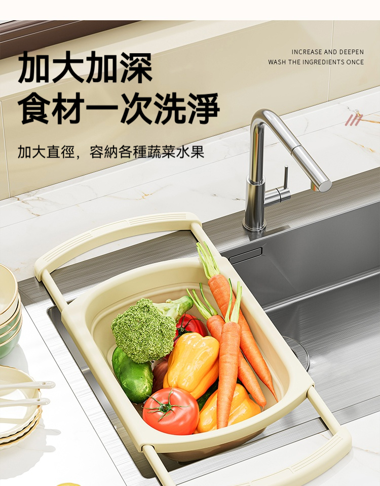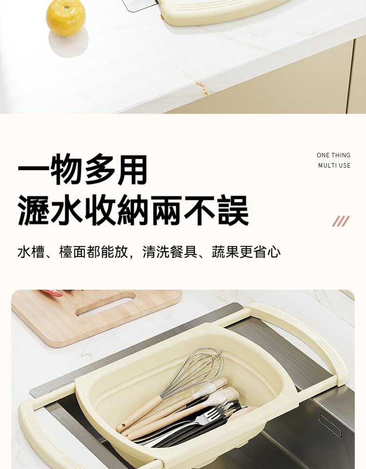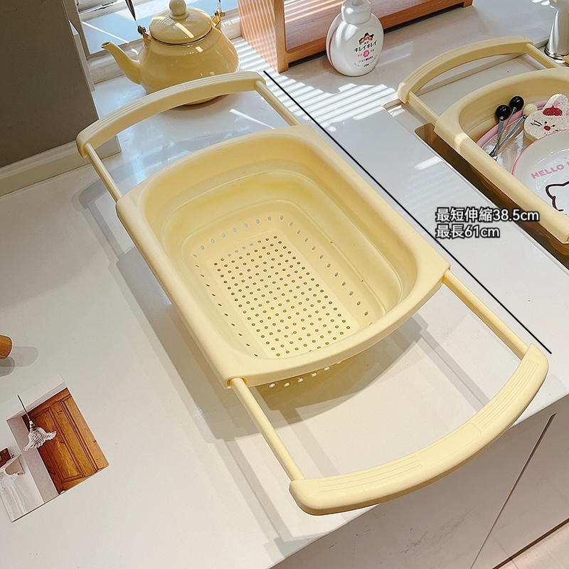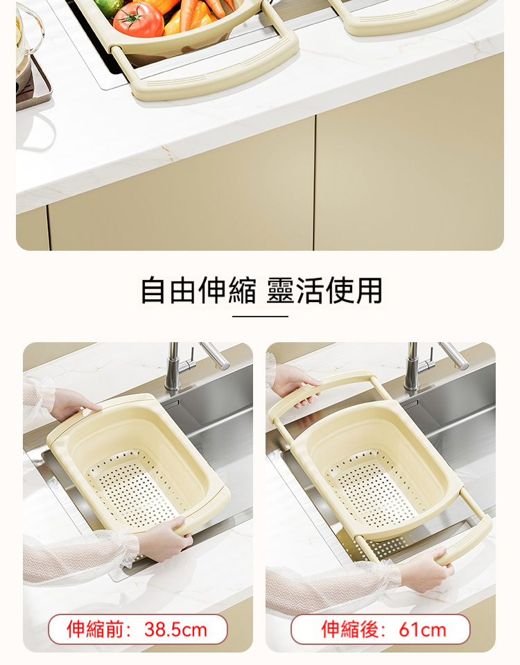 🌟【三大實用亮點】🌟▫️ 伸縮設計:自由調節長度,完美適配各種水槽尺寸🧩▫️ 雙層瀝水槽:濾水不積水,洗菜洗水果都方便🍎▫️ 可折疊收納:節省空間不佔位,旅行露營也能帶走🚗